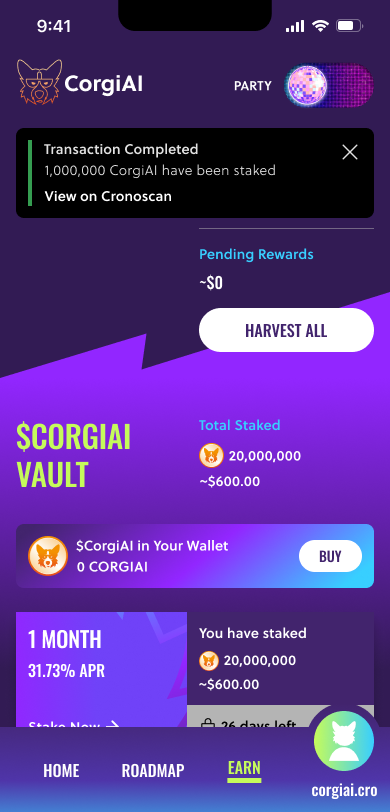 Step 5. You have successfully staked the $CORGIAI into our staking vaults!